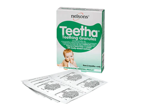Nelsons Teetha Teething Granules from 3 Months+ Only 24 Sachets is a homeopathic medicinal product without approved therapeutic indications.