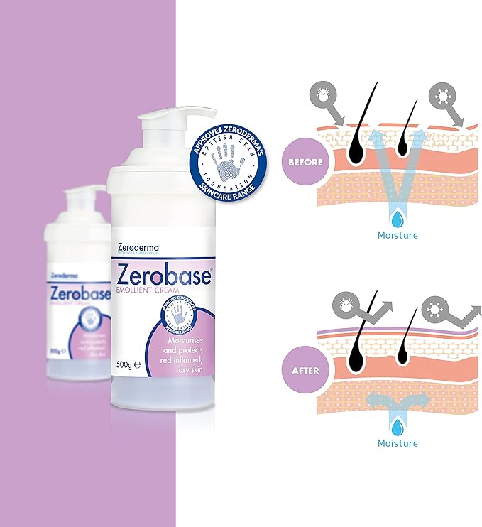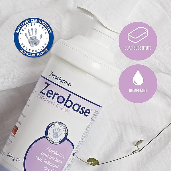 Zerobase Emollient Cream 500g softens, moisturises and protects the skin. It relieves the symptoms of red, inflamed damaged, dry or chapped skin and as an emollient protects raw areas of skin. If you have eczema the cream can also be applied before a bath to stop the skin drying further.